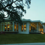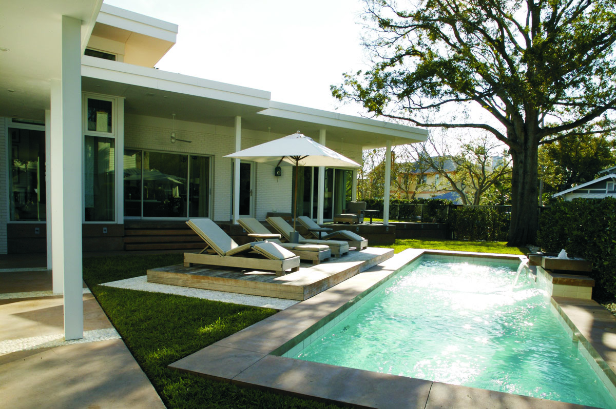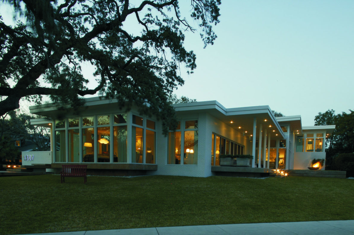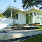 Using Mid-Century Modernist design elements, the architect created a bold look that responds to the scale of the neighborhood and the requirements of the Architectural Review Committee criteria. The home cascades down a sloped site to take advantage of water views and morning sunlight.