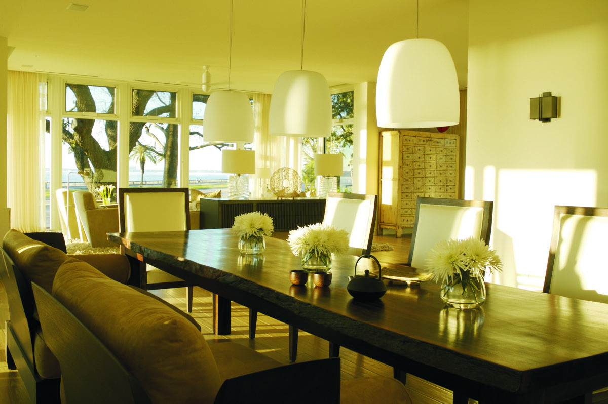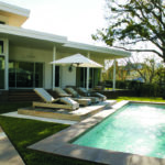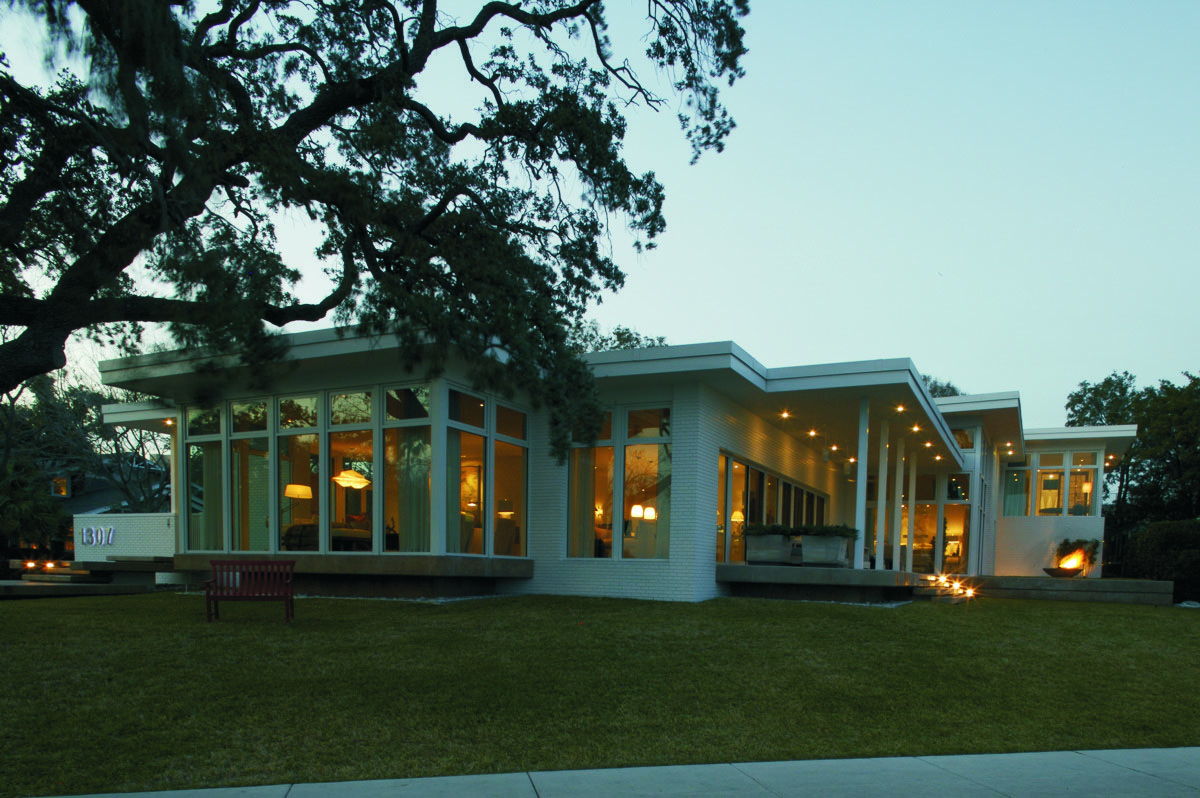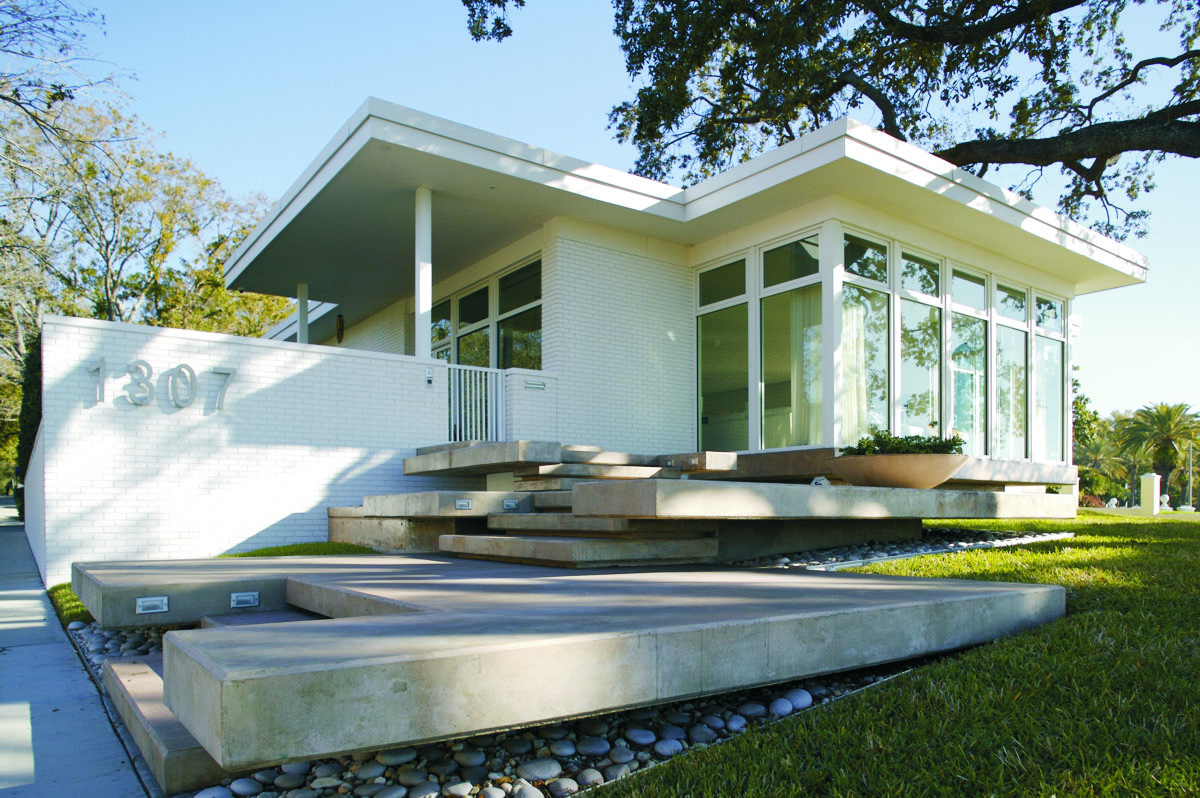 Using Mid-Century Modernist design elements, the architect created a bold look that responds to the scale of the neighborhood and the requirements of the Architectural Review Committee criteria. The home cascades down a sloped site to take advantage of water views and morning sunlight.