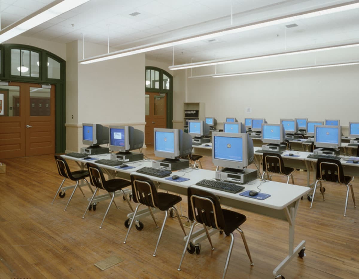 Approximately 80% of the school’s three story interior was replaced. All interior plaster was removed and replaced with drywall. Terrazzo floors were repaired and hardwood floors were repaired and refinished. Doors and door frames were refinished and all windows were replaced.