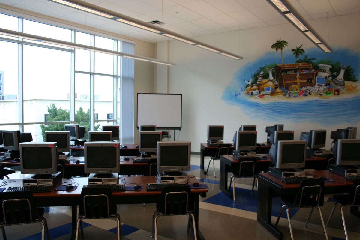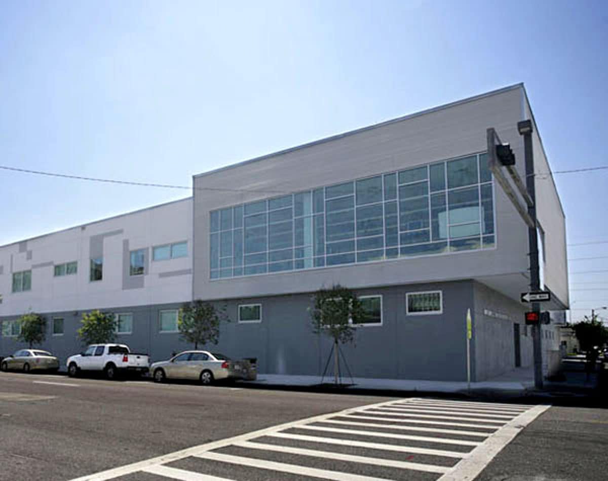 The campus, which encompasses two city blocks, consists of a two-story elementary school building with administrative offices and a media center which serves both the elementary school and the middle school students; a single story cafeteria building; and a middle school classroom building which is elevated to provide a covered play area and covered spaces for student drop-off/pickup. The design also includes a rooftop art classroom and a dance studio.
